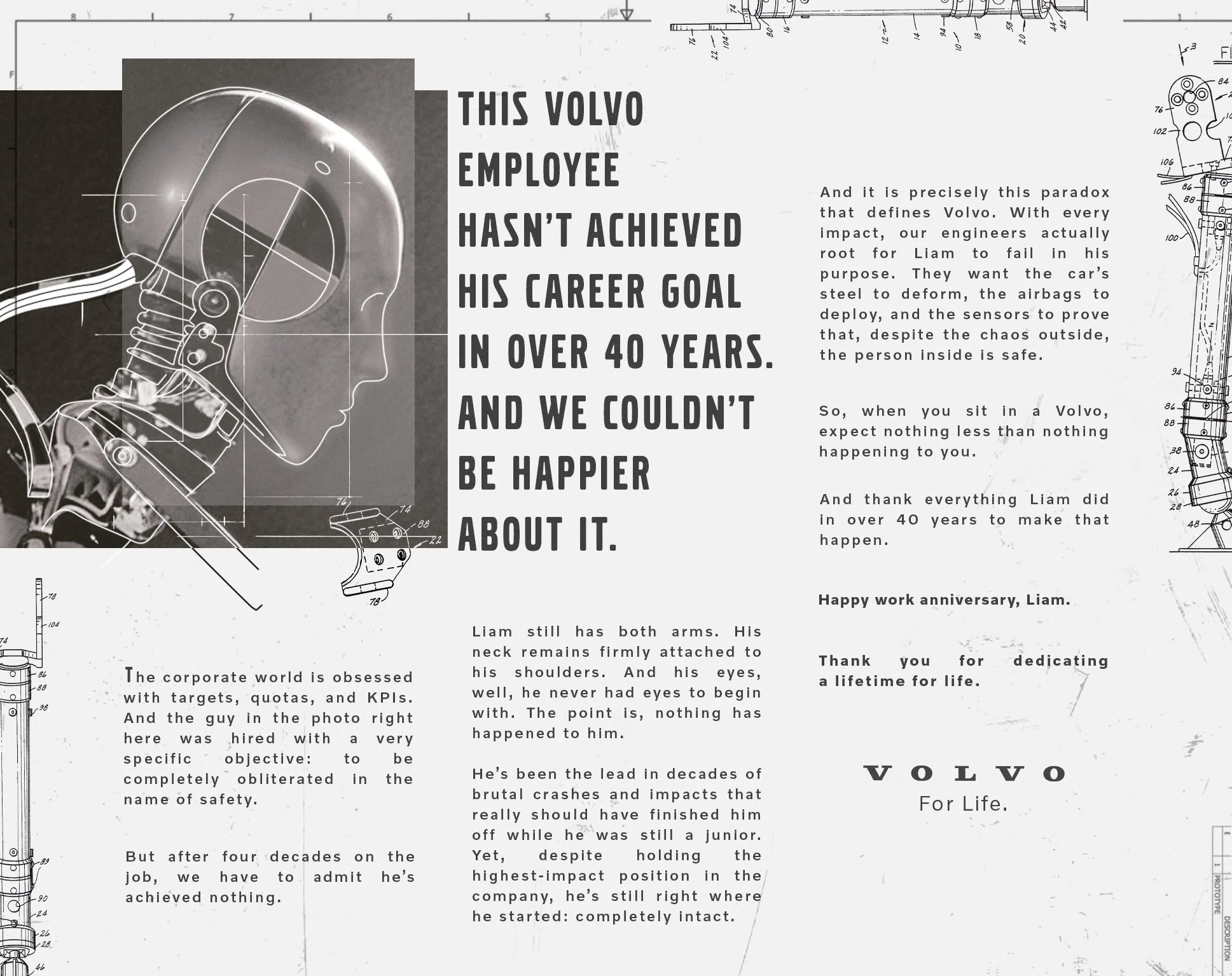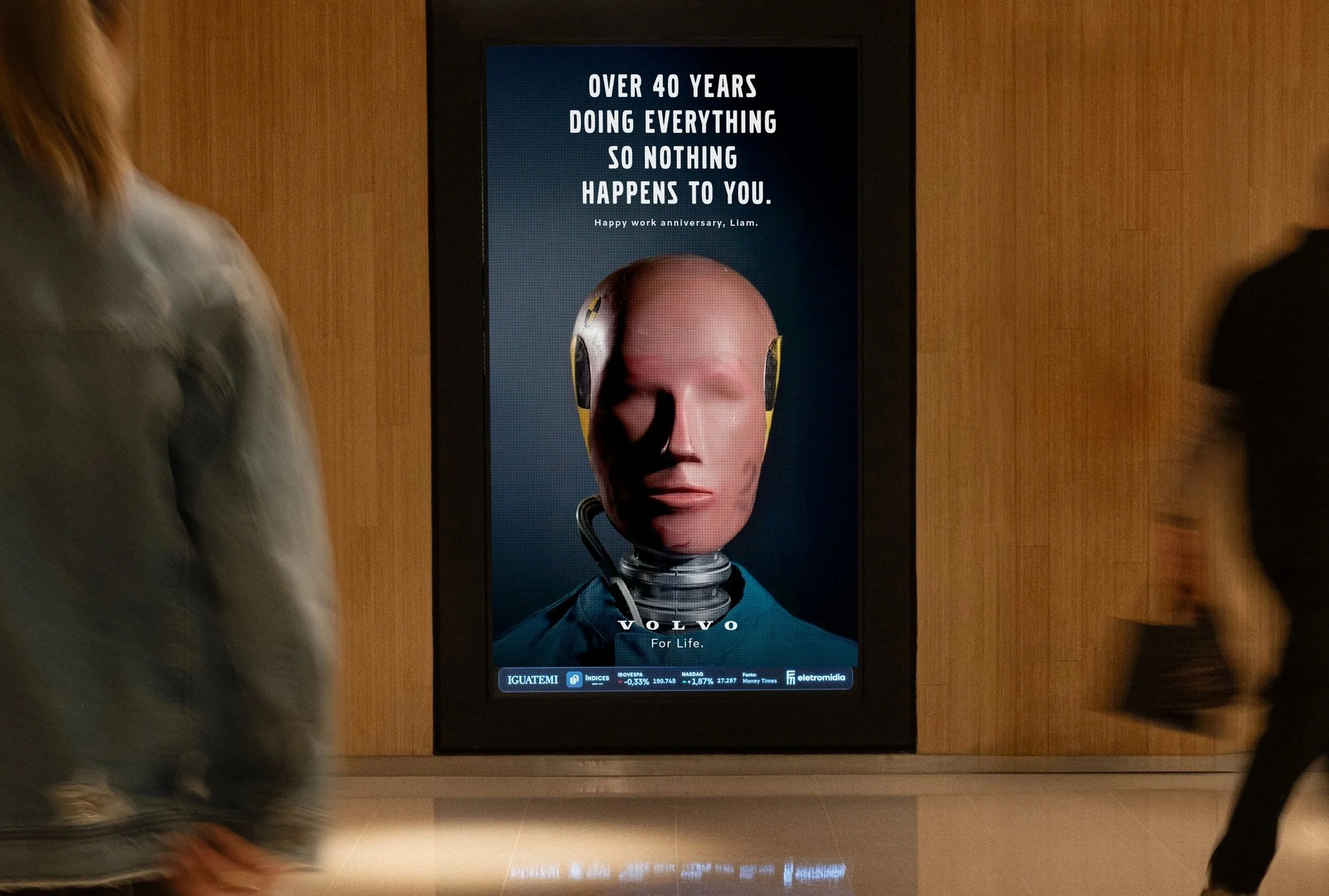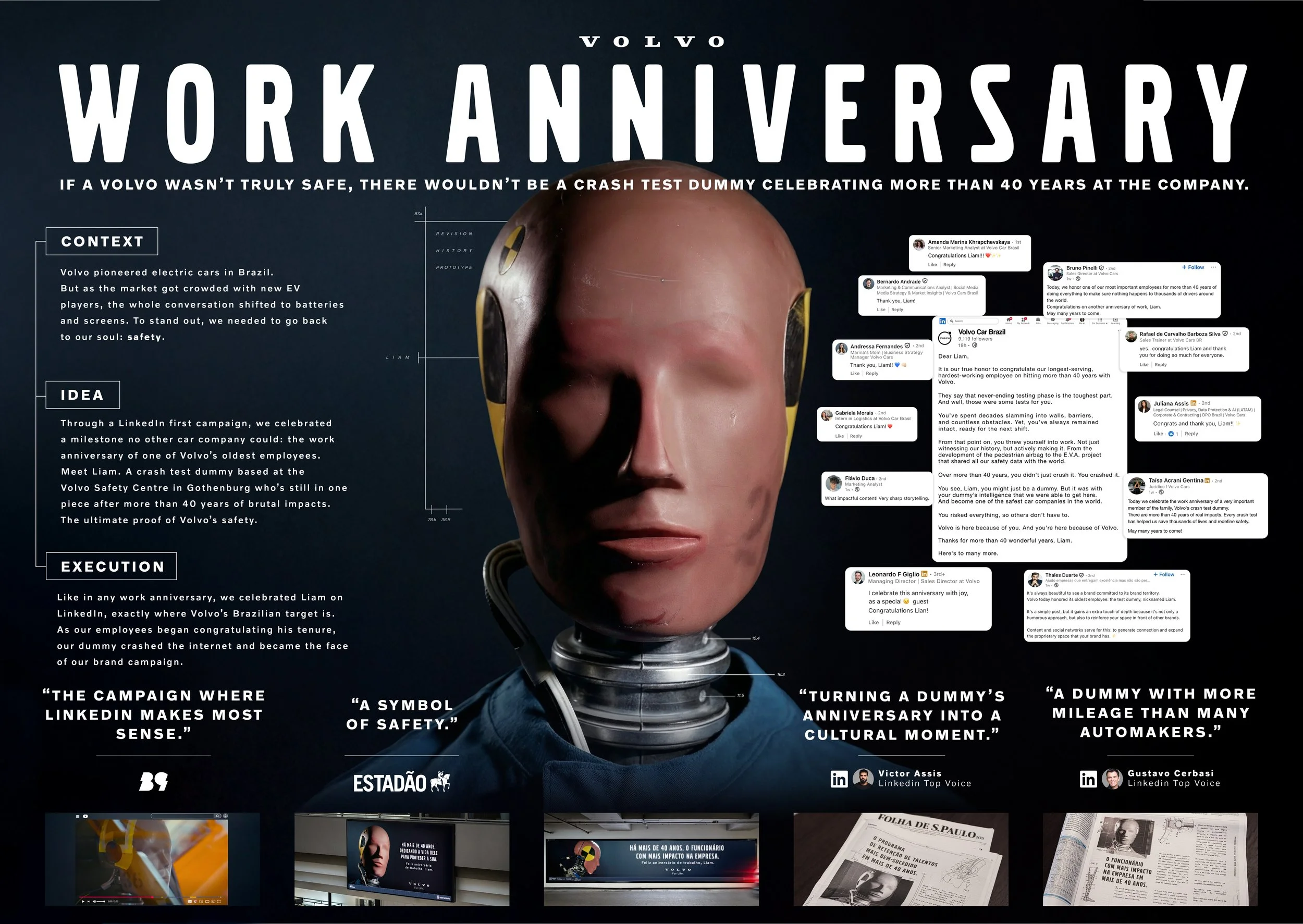 Volvo has crash test dummies that have been on the job for over 40 years. There’s no greater proof that its cars are synonymous with safety. It may be one of the riskiest jobs in the world, yet they’re still there. From this insight, we created Work Anniversary, celebrating another year of work by Liam, one of these dummies. The tribute starts on LinkedIn, where work anniversaries are typically celebrated, and where our audience in Brazil, executives and C-level professionals, is highly active. The campaign expands with a print ad in a leading national newspaper and out-of-home placements across streets and dealerships.