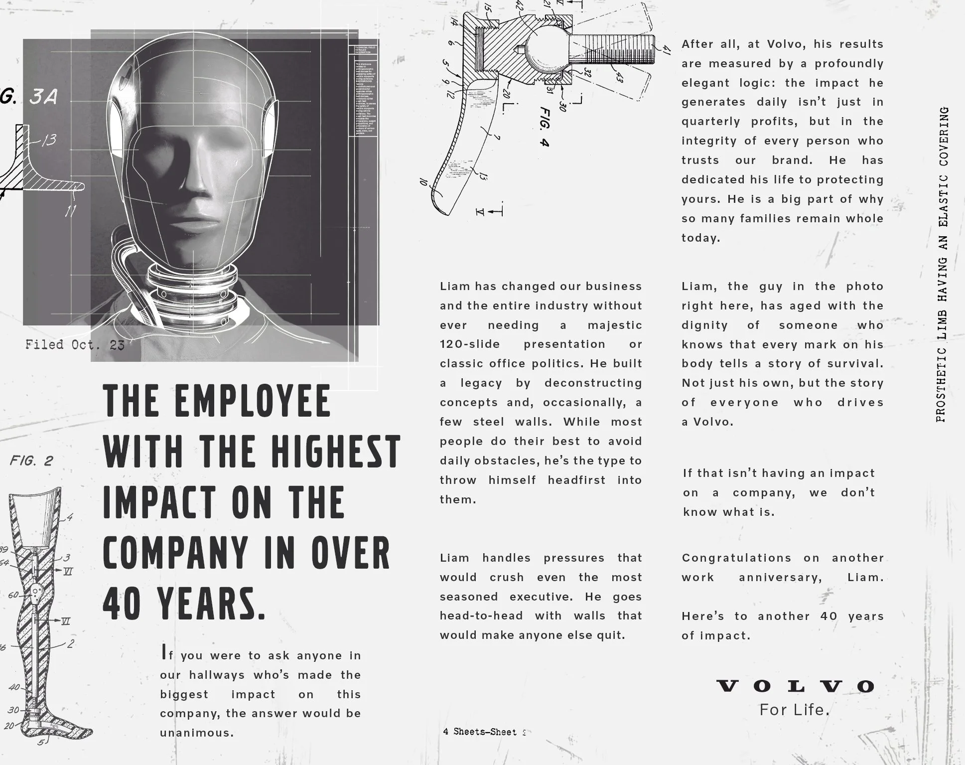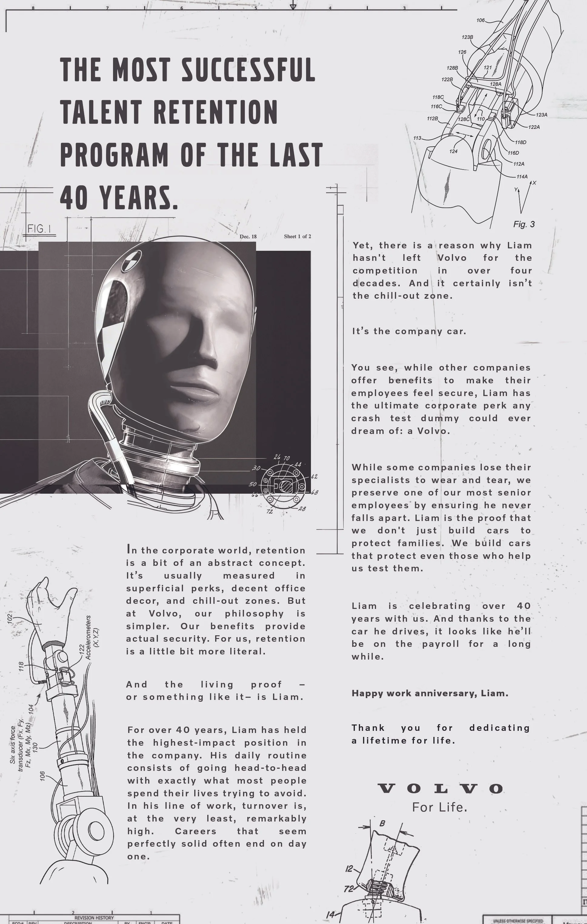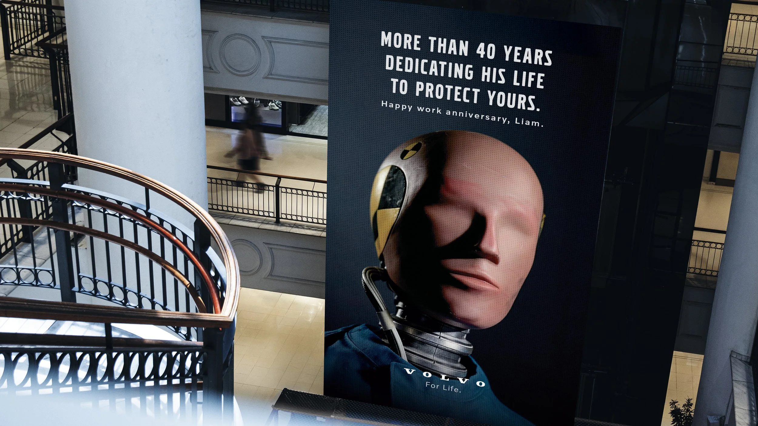 Volvo has crash test dummies that have been on the job for over 40 years. There’s no greater proof that its cars are synonymous with safety. It may be one of the riskiest jobs in the world, yet they’re still there. From this insight, we created Work Anniversary, celebrating another year of work by Liam, one of these dummies. The tribute starts on LinkedIn, where work anniversaries are typically celebrated, and where our audience in Brazil, executives and C-level professionals, is highly active. The campaign expands with a print ad in a leading national newspaper and out-of-home placements across streets and dealerships.